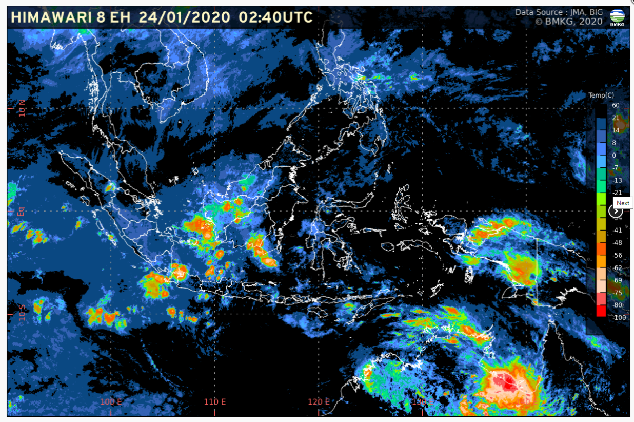Berdasarkan kondisi tersebut, BMKG memprakirakan dalam periode sepekan ke depan, curah hujan dengan Intensitas Lebat yang dapat disertai kilat/petir berpotensi terjadi di wilayah sebagai berikut: Periode 24-26 Januari 2020 : – Sumatra Utara – Sumatra Barat – Bengkulu – Jambi – Sumatra Selatan – Kep. Bangka Belitung – Lampung – Banten – DKI Jakarta – Jawa Barat – Jawa Tengah – DI Yogyakarta – Jawa Timur – Kalimantan Barat – Kalimantan Tengah – Kalimantan Selatan – Sulawesi Barat – Sulawesi Tengah – Sulawesi Selatan – Papua.