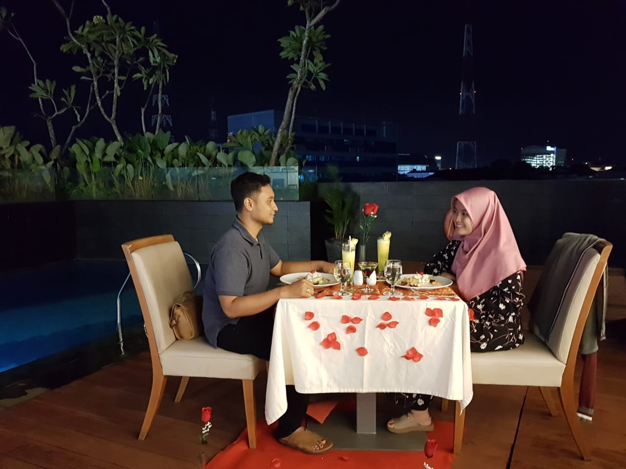 Menurutnya, untuk paket Rp 400.000,- net/couple akan mendapatkan cheese lumpia spicy peanut sauce, Caesar salad, zuppa soup, lemon sorbet, beef tenderloin roll pan fried with brown sc vegetable and lasagna pasta, panna cotta, dan fruit skewer dan makan malam romantis dihiasi lilin ditepi kolam renang. Kemudian untuk memperlengkap kejutan manis mu, acoustic performance juga doorprize siap menemani mu dan pasangan. Kamu bisa menikmati promo ini mulai pukul 6 hingga 8 malam. Hotel Santika Radial Palembang menyediakan 149 kamar yang terdiri dari empat tipe kamar: Superior, Deluxe, Premiere dan Suite, dengan menawarkan pemandangan Jembatan Ampera yang melegenda dan mall terbaru di Palembang, Palembang Icon. Setiap kamar yang terdapat di Hotel Santika Radial Palembang dilengkapi oleh LED TV, Coffee/tea maker, minibar, Safe Deposit Box (SDB) dan speed WiFi.