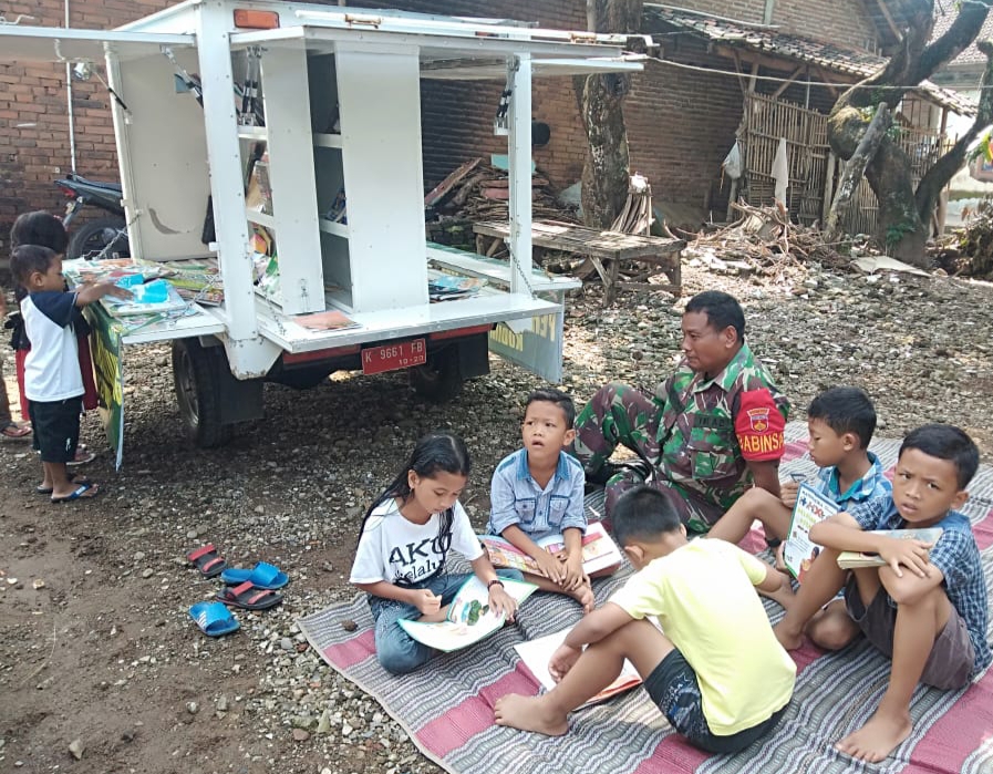 KORDANEWS – Di suasana hari yang semakin cerah membuat sosok Babinsa kreatif sangat sabar dan setia menunggu anak anak melalui grobak baca keliling yang di nanti warga terutama anak anak warga Desa Kedungsari Kecamatan Gebog Kabupaten Kudus,Minggu 05/04/2020.