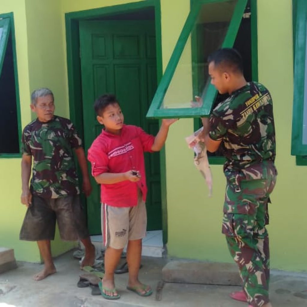 Nampak anggota Satgas TMMD dengan di bantu oleh Danang (12) anak tetangga dari pak Sulkan salah satu penerima bantuan RTLH dengan semangat membatu membersihkan bekas cat yang menempel pada kaca.