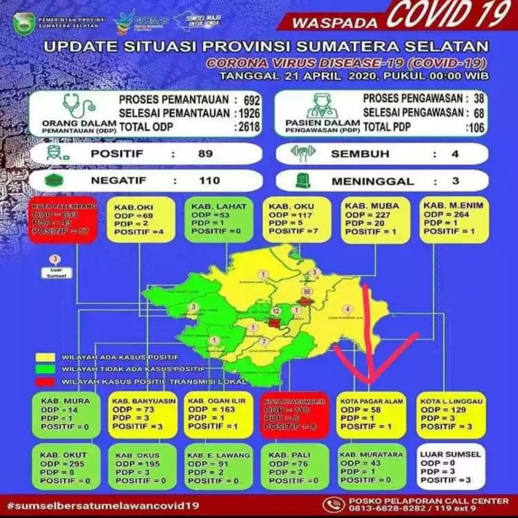 Meski demikian sang pasien belum sempat ke Pagaralam langsung diisolasi ke Rumah sakit Mohammad Hoesin Palembang. Hal ini sesuai dengan tabel Covid 19 Propinsi Sumatera Selatan (Sumsel) tertanggal 21 April, yang menyebutkan, 58 ODP, 1 PDP dan satu warga asal Pagaralam Positif.