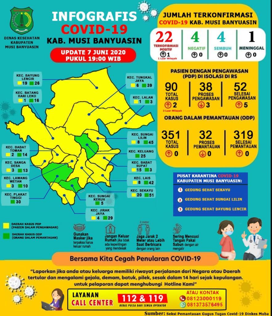 Penambahan positif Covid-19 tersebut yakni kasus 22 jenis kelamin laki-laki usia 69 tahun Desa Sukamaju Kecamatan Babat Supat (Lokal). Dengan penambahan 1 kasus ini, total positif Covid-19 di Muba menjadi 22 kasus, 4 kasus diantaranya telah sembuh, dan 1 meninggal dunia.