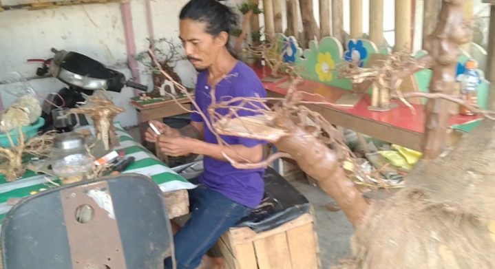 “Saya baru-baru nih mencoba usaha ini, membuat bonsai kelapa karena saya lihat ada buah kelapa yang hanyut dan dimanfaatkan untuk ditanam, kemudian waktu saya main dikebunnya teman terlintas dipikiran saya untuk membuat ini” jelas Bambang selaku Pengrajin sambil melihatkan akar pohon yang sedang dirangkainya menjadi hal yang menarik. Minggu (7/6)