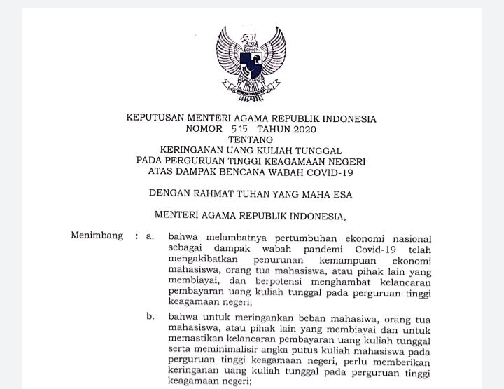 Kementerian Agama menerbitkan Keputusan Menteri Agama (KMA) tentang Keringanan Uang Kuliah Tunggal (UKT) Pada Perguruan Tinggi Keagamaan Negeri (PTKN) atas Dampak Bencana Wabah Covid-19 yang ditandatangani oleh Menteri Agama pada tanggal 12 Juni 2020.