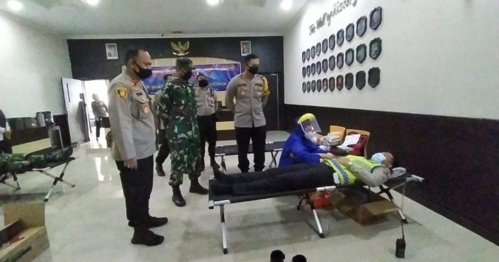 Pelaksanaan apel dan giat donor darah tetap menggunakan protokol kesehatan untuk mencegah penularan Covid-19.
