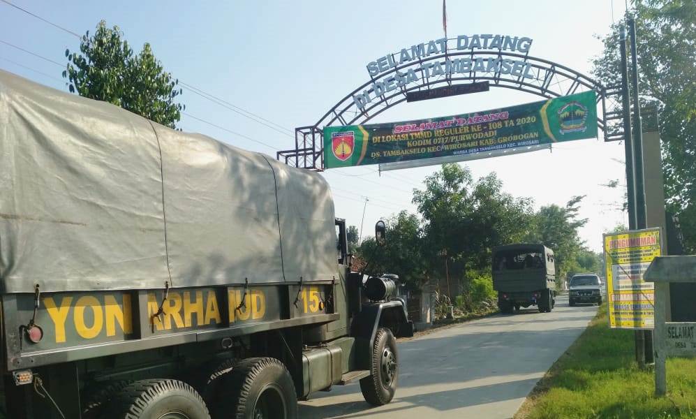 Kordanews – Rombongan pasukan dari Yon Arhanud 15, Semarang saat memasuki gapura pintu masuk Desa Tambakselo, Kecamatan Wirosari, Kabupaten Grobogan, denan lantang menerikan yel-yel, ”Tambakselo kami datang untuk membangun … ”