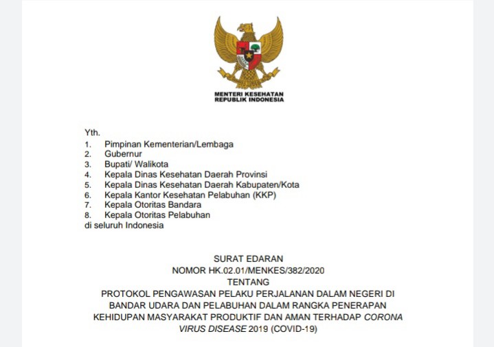 SE tersebut tentang Protokol Pengawasan Pelaku Perjalanan Dalam Negeri di Bandara Udara dan Pelabuhan Dalam Rangka Penerapan Kehidupan Masyarakat Produktif dan Aman Terhadap Corona Virus Disease 2019 (Covid-19). Tautan: