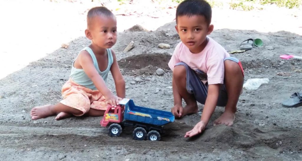 Seperti yang dilakukan Eko (3) asal Dukuh Kenteng, Desa Tambakselo yang nekad bermain mobil-mobilan di tumpukan pasir (3) sambil momong adiknya yang masih umur 14 Bulan.