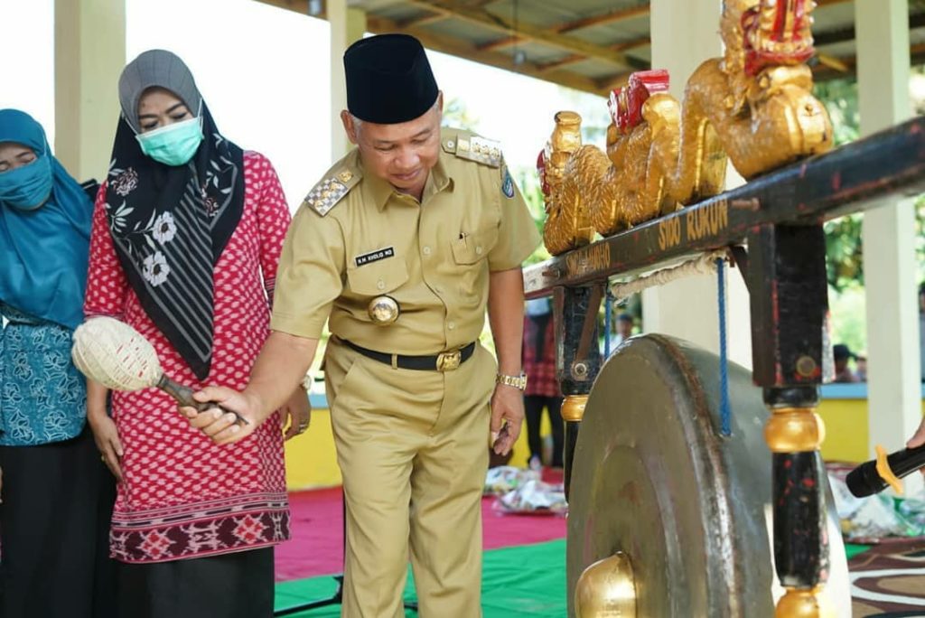 Bupati OKU Timur HM. Kholid MD didampingi Ketua TP-PKK OKU Timur Hikmatul Maslikhah beserta Kepala OPD menghadiri peresmian pasar hewan di desa Sumber Harjo Kecamatan Buay Madang Timur.