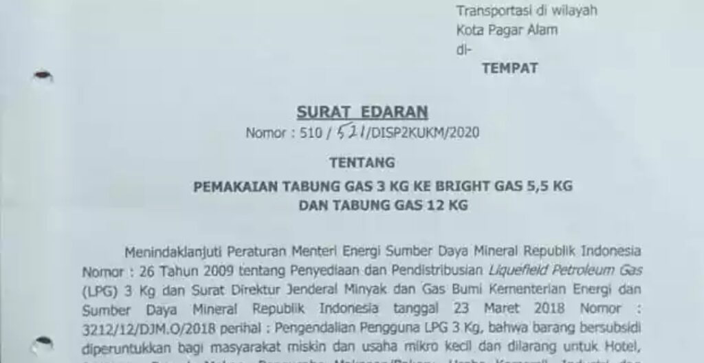 KORDANEWS – PAGARALAM -Walikota Pagaralam Alpian Maskoni SH keluarkan surat edaran nomor 510/52/DISP2KUKM/2020 tentang pemakaian tabung gas LPG 3 KG dan tabung gas 12 kg dan surat edaran nomor 510/ 543/ DISP2KUKM/2020 tentang imbauan kepada pegawai negeri sipil (PNS) Pagaralam agar tidak gunakan gas liquefied fetroleum gas LPG 3 Kg.