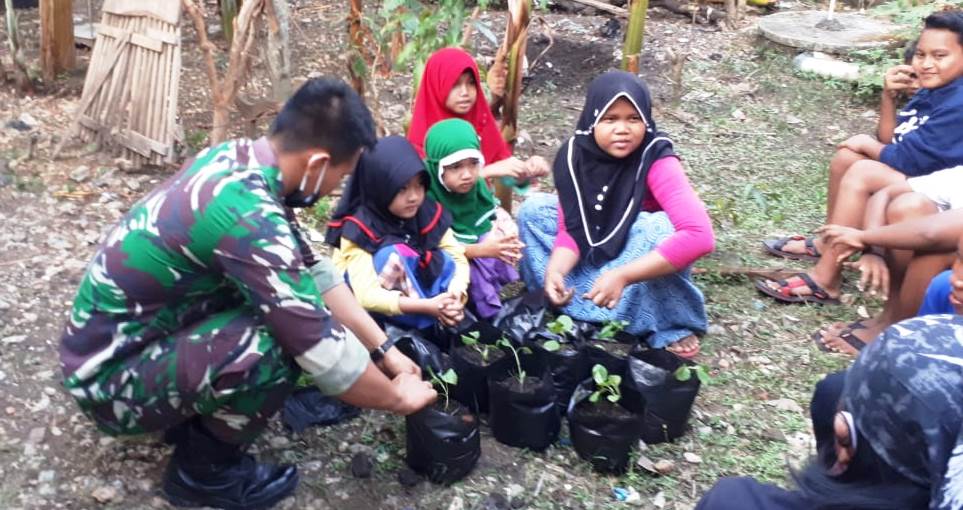 Salah satunya adalah menularkan ilmu menanam, seperti yang dilakukan oleh Prada Makmur, salah satu anggota Satgas TMMD, yang sempatkan mengajari anak-anak di Desa Tambakselo bagaimana menanam tanaman di polybag.