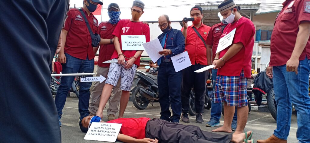 KORDANEWS – Rio Pambudi Wijaksono (25) calon pengantin korban pembunuhan yang dilakukan tersangka Okta Candra (31) dan Rizki Ananda alias Jek (27) di Griya Macan Lindungan Permata, Jalan Macan Lindungan, Kecamatan Ilir Barat I turut hadir dalam rekonstruksi yang digelar di Mapolsek Ilir Barat I Kamis (6/8).