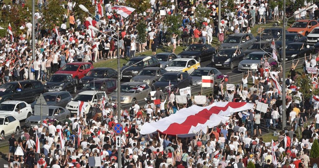 Meneriakkan “Pergi!”, Para pendukung oposisi berbaris di Jalan Kemerdekaan, beberapa membawa bendera merah dan putih, dulu bendera negara dan sekarang digunakan untuk mewakili oposisi terhadap pemerintah Lukashenko.