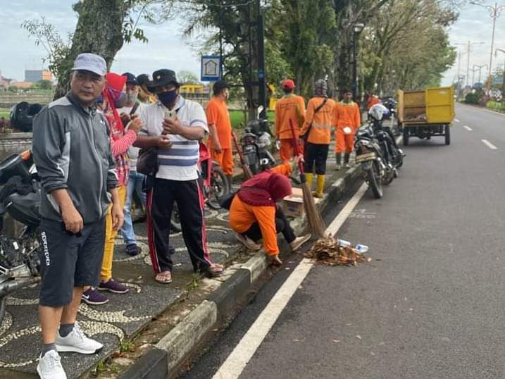 Minggu (16/8) pagi, tampak Sekretaris Daerah Muba Apriyadi juga turut ikut gotong royong bersama pasukan orange di sepanjang jalan protokol Wahid Udin.