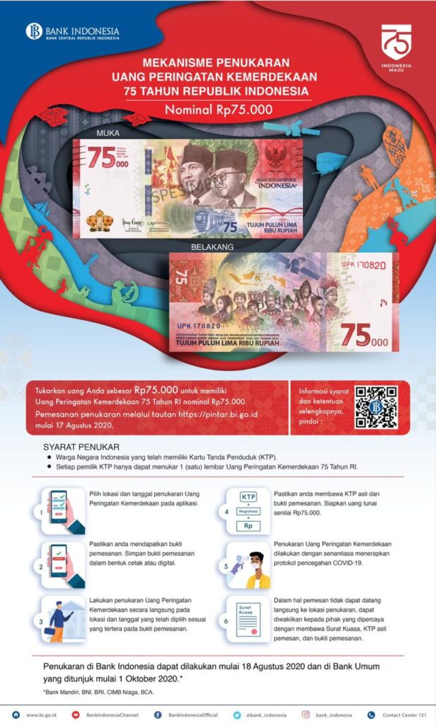 KORDANEWS-Tingginya antusiasme masyarakat dari #SobatRupiah yang ingin memiliki Uang Peringatan Kemerdekaan (UPK) 75 Tahun RI, menyebabkan Bank Indonesia membuka layanan penukaran secara kolektif. Layanan ini terbagi menjadi tiga peruntukkan, yakni Kementerian/ Lembaga/Instansi, Korporasi/Asosiasi/ Perkumpulan, dan masyarakat umum.