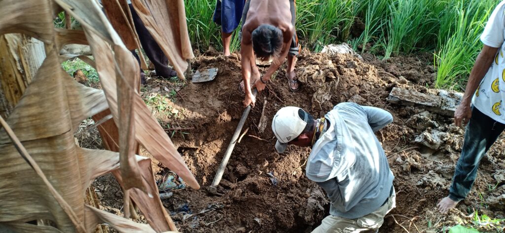 Menurut Muslimin saat dikubur, korban sudah tewas lalu korban dia masukkan ke dalam karung kemudian dia seret ke pinggiran sepetak sawah, lalu dia kubur.