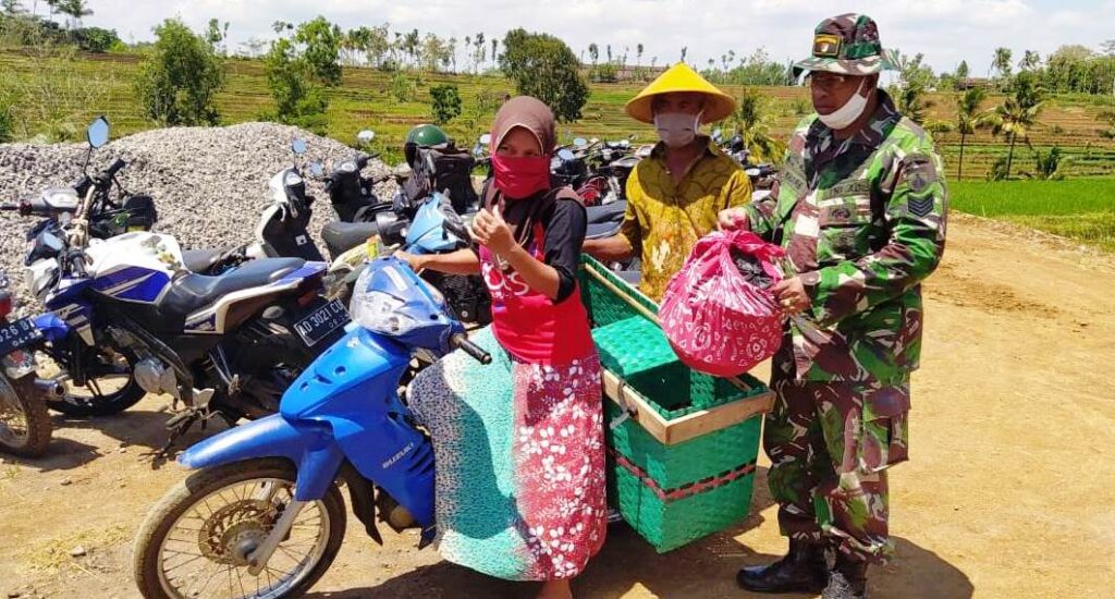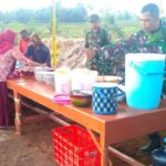 Tidak hanya berpeluh keringat saat gotong royong, Serka A. Kharis disela-sela waktu istirahat juga membantu aktivitas sederhana yang dikerjakan oleh Suparmi (54), seorang ibu yang mengirimkan makan siang untuk semua orang yang terlibat dalam kegiatan tersebut.