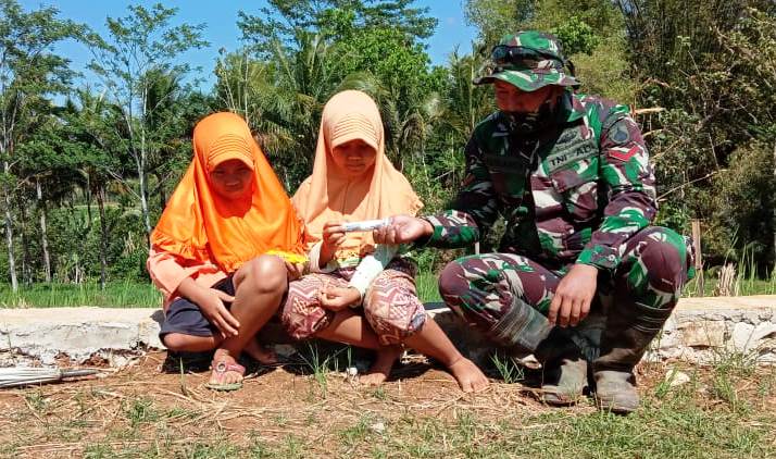 Seperti yang dilakukan oleh Koptu Sugiono, salah satu anggota Satgas TMMD Kodim Karanganyar. Di sela-sela tugas TMMD, sebagai bentuk rasa simpati terhadap warga, personil Satgas TMMD Reguler ke-109 Kodim 0727/Karanganyar/Korem 074/Warastratama, itu terus mendkati anak-anak di Desa Jatiwarno, Kecamatan Jatipuro, Kabupaten Karanganyar, Jawa Tengah.