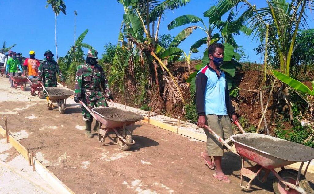 Danramil 14/Jatipuro Kapten Arm. Suratman, mengatakan dengan semangat gotong royong, satgas TMMD bersama warga bahu membahu langsir material bahan cor menggunakan angkong.