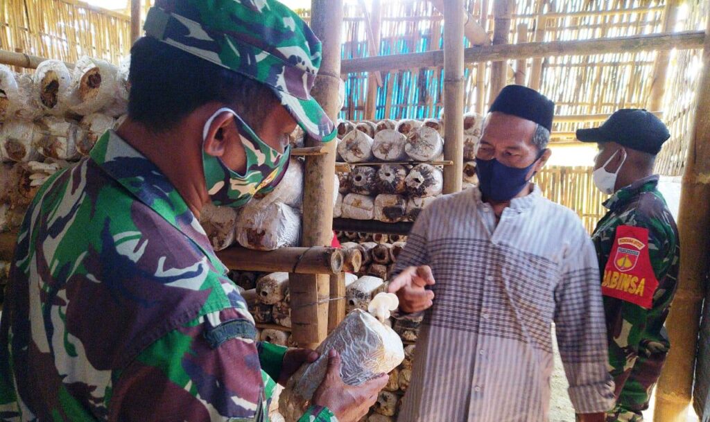 KORDANEWS – Disela-sela pelaksanaan TNI Manunggal Membangun Desa (TMMD) Reguler ke -109 Kodim 0727/ Karanganyar di Desa Jatiwarno, Kecamatan Jatipuro, Kabupaten Karanganyar, Jawa Tengah, Bintara Pembina Desa (Babinsa) Jatiwarno, Sertu Untung Trijaya mengunjungi warga yang memiliki usaha jamur tiram.
