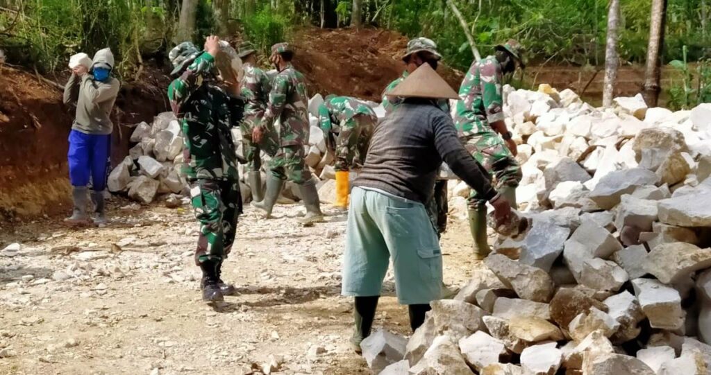 Mereka saling menopang untuk melangsir batu yang akan digunakan untuk membanun jembatan, salah sati sasaran fisik TMMD yang secara resmi akan dibuka tanggal 22 September 2020 mendatang itu.