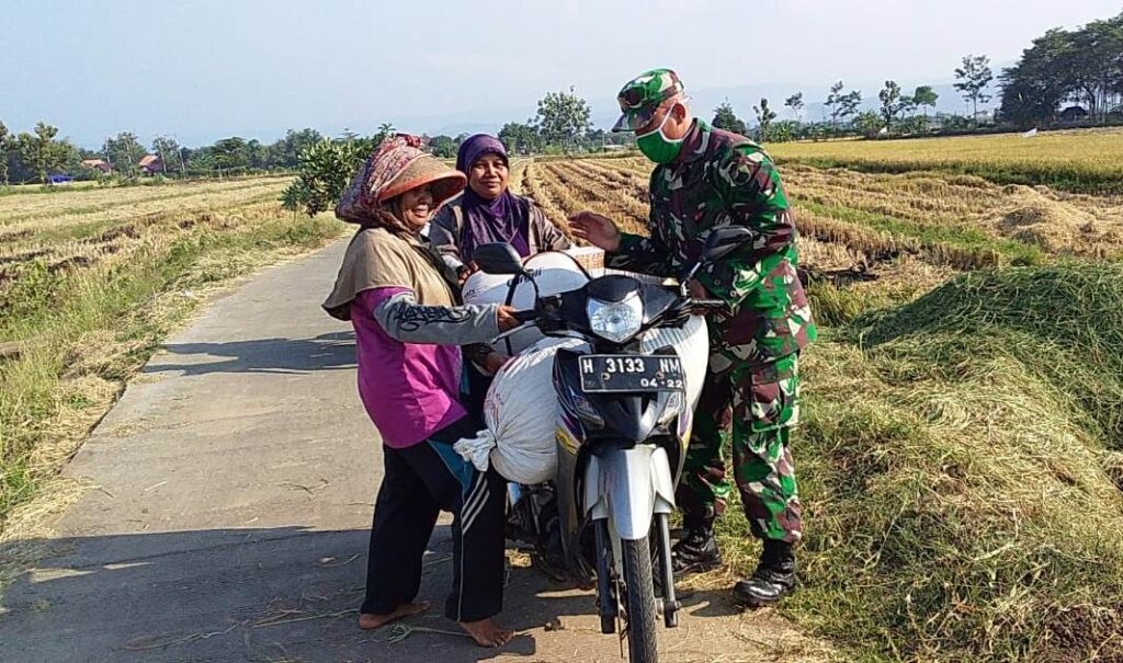 Salah satu anggota Satgas TMMD Sendangkulon yang kebetulan melintasi jalan pertengahan sawah itu merasa senang bisa membantu warga,ibu ibu mengangkat hasil panen dari sawah yang membutuhkan pertolongan.