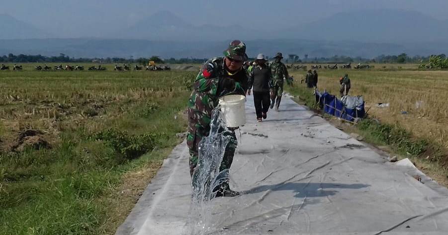 Kali Ini beberapa personil Satgas TMMD bahu membahu untuk melakukan penyiraman hasil betonisasi jalan, rasa lelah tak pernah mereka perlihatkan, keceriaanlah selalu terpancar di wajah.