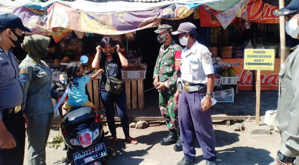 KORDANEWS – Sebagai upaya menumbuhkan kesadaran masyarakat untuk menggunakan masker, dan upaya mencegah penularan virus corona dan memutus mata rantai virus Covid-19, tiga pilar, yang meliputi, Satgas TMMD, Polsek Jatipuro, serta Satpol-PP Kecamatan Jatipuro, Karanganyar gelar patroli masker di Pasar Jatipuro.