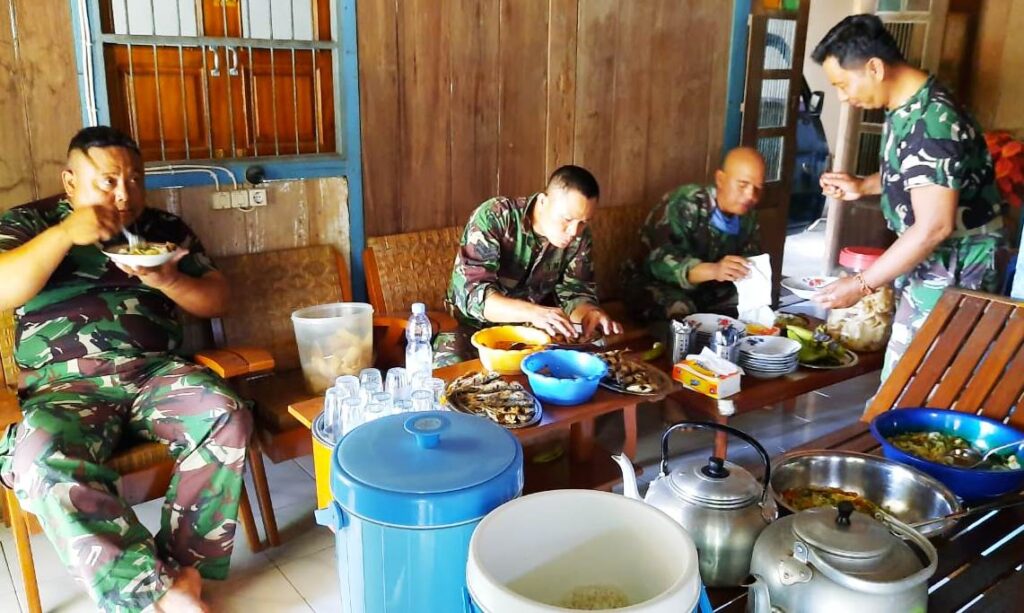 KORDANEWS – Kompak prajurit Satuan Tugas (SATGAS) TNI Manunggal Membangun Desa (TMMD) Ke 109 Kodim 0715/Kendal menikmati makan siang bersama di rumah warga setelah dari pagi fokus bekerja pada sasaran pengecoran jalan di Desa Sendang Kulon Kecamatan, Kamis (17/9/20).