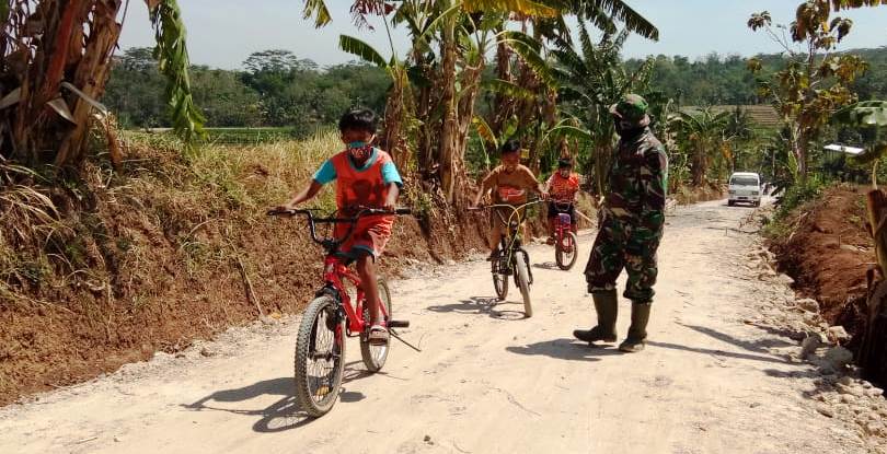 Dengan menaiki sepeda, anak-anak ini mencoba jalan yang sudah mulai dilakukan pengurugan oleh Satgas TMMD bersama dengan warga.