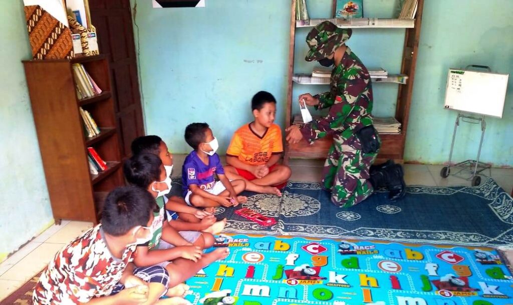 Terlihat banyak anak-anak yang senang di raut wajah mereka menyambut pembagian permen yang dilakukan Sertu Heryadi anggota satgas TMMD Kodim 0727 /Karanganyar .