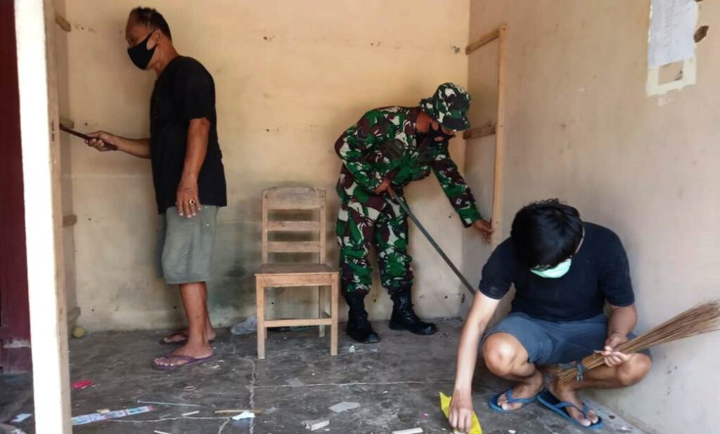 Kebetulan saat berkunjung ke rumah Tukijo, pemilik rumah sedang memperbaiki warung kelontong. Dengan sigap dan cepat Sertu Indro langsung membantu bapak Tukijo.