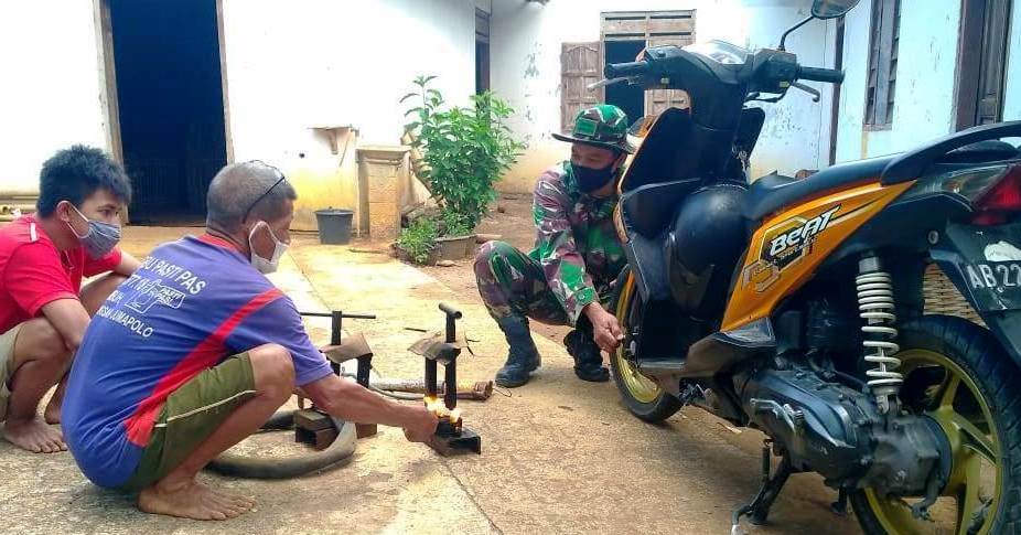Seperti halnya yang dilakukan Sertu Heryadi, anggota Satgas TMMD Reguler 109, dia mau membantu menambal ban sepeda motor yang bocor milik warga Suprapto, warga Dusun Trugo Rt 05 RW 04, Desa Jatiwarno, Kecamatan Jatipuro, Kabupaten Karanganyar.