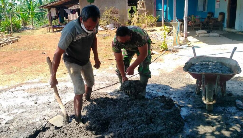 Tampak anggota satgas TMMD, Pratu Anwar bersama warga tampak cocok dalam meramu adukan semen di pembangunan RTLH yang dilaksanakan Kodim 0727 Karanganyar. Di rumah pak Ariyadi pada saat ini sudah mulai melaksanakan pengecoran lantai rumahnya.