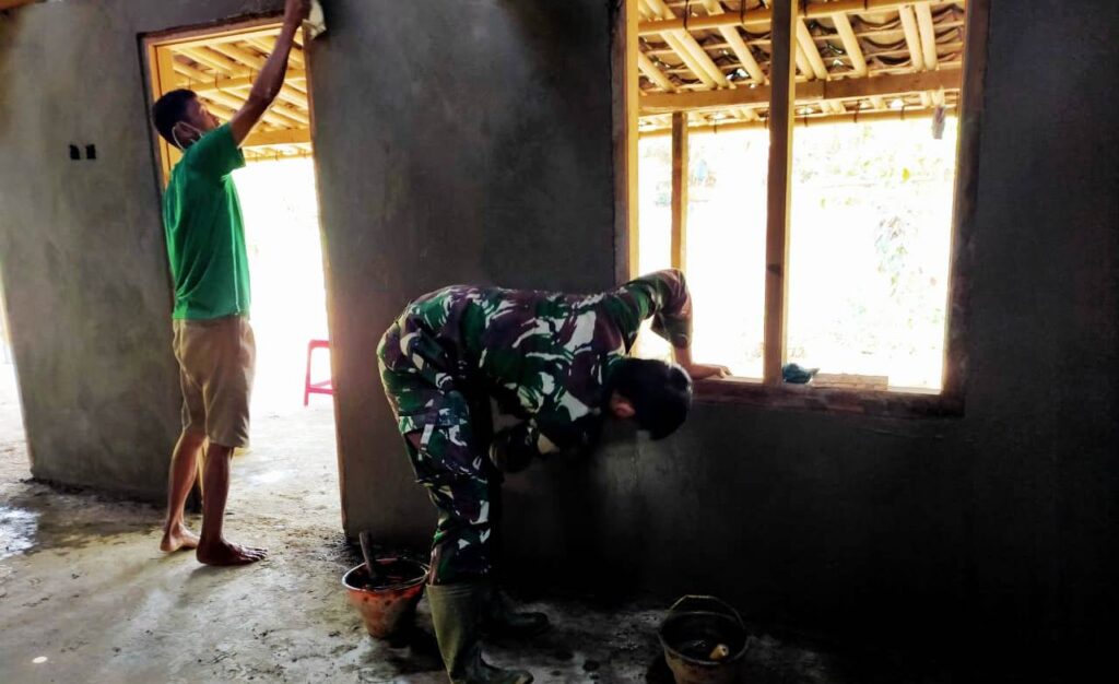 Hal itu terlihat, saat Kopda Sumbiring anggota satgas TMMD Reguler 109, kebut pekerjaan plester dinding RTLH milik Bapak Suripto agar cepat rampung.