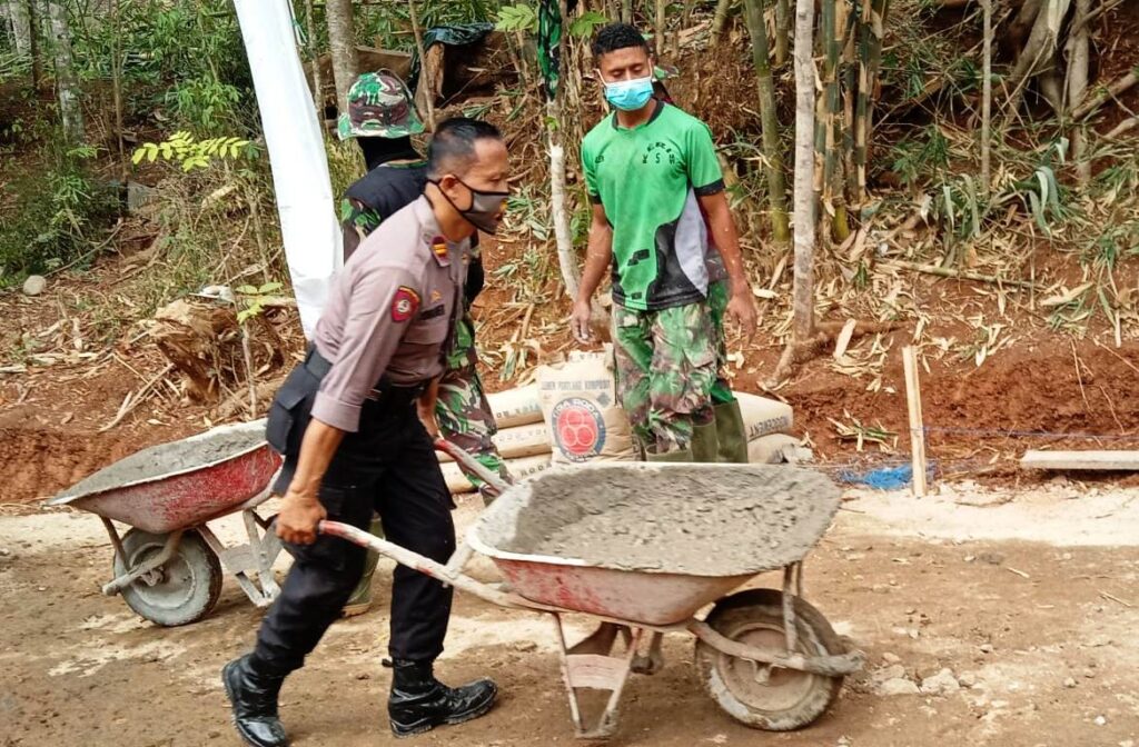 KORDANEWS – Pemandangan menarik tersaji di lokasi betonisasi jalan, pada program TMMD) Reguler ke 109 Kodim 0727/Karanganyar, di Desa Jatiwarno, anggota polsek dengan seragam dinas terlihat ikut bahu membahu bersama warga mendorong angkong.