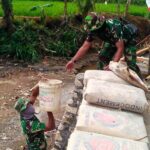 Selain Sertu Heryadi, juga ada warga yang sedang memanggul semen. Namun supaya beban terasa ringan maka pekerjaan mengangkut material ini mereka lakukan dengan menggotong bersama meskipun hanya dengan menggunakan peralatan seadanya.”tutupnya Sertu Heryadi.