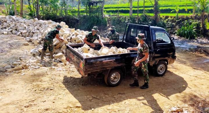 Hal itu terlihat saat Serma Ngadiman dan beberapa anggota satgas TMMD lainnya sedang mengangkut batu dengan cara estafet dari mobil pick up pada lokasi pembangunan talud di Dusun Sonosari, Desa Jatiwarno, Kecamatan Jatipuro Kabupaten Karanganyar.