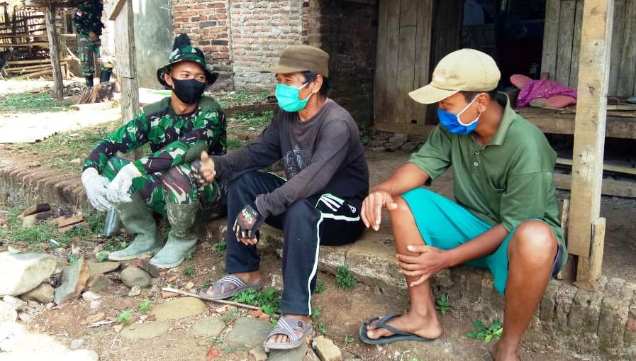 Seperti yang terlihat, Praka Bayu, anggota Satgas TMMD, bersama Bapak Sukiman (53) dan Bapak Sukarno(48) sedang ngobrol dengan diselingi bercanda ria.