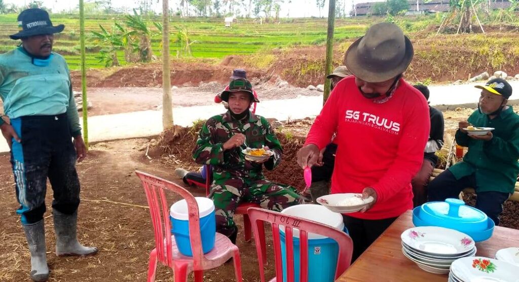 KORDANEWS – Satuan Tugas (SATGAS) TNI Manunggal Membangun Desa (TMMD) Ke 109 Kodim 0727/Karanganyar menikmati makan siang bersama dengan warga di tenda dapur TMMD, setelah dari pagi fokus bekerja pada sasaran pengecoran jalan di Dusun Trugo Desa Jatiwarno.