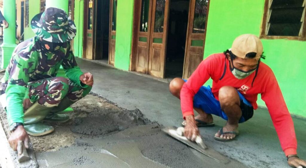 Hal itu terlihat saat Serda Agus, anggota satgas TMMD Reguler ke 109 bersama dengan dengan warga terus mengerjakan plester lantai milik Rudiyanto, warga Dusun Sonosari Desa Jatiwarno.