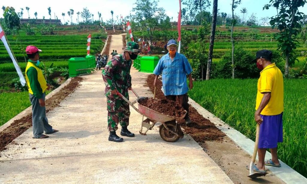 Hal itu terlihat saat Anggota Satgas TMMD Reguler ke 109, Serda Edi Suprayitno, bersama dengan warga ikut membantu warga Dusun Gandu, Desa Jatiwarno, untuk melakukan pengurukan bahu jalan yang selesai dilakukan pengecoran.