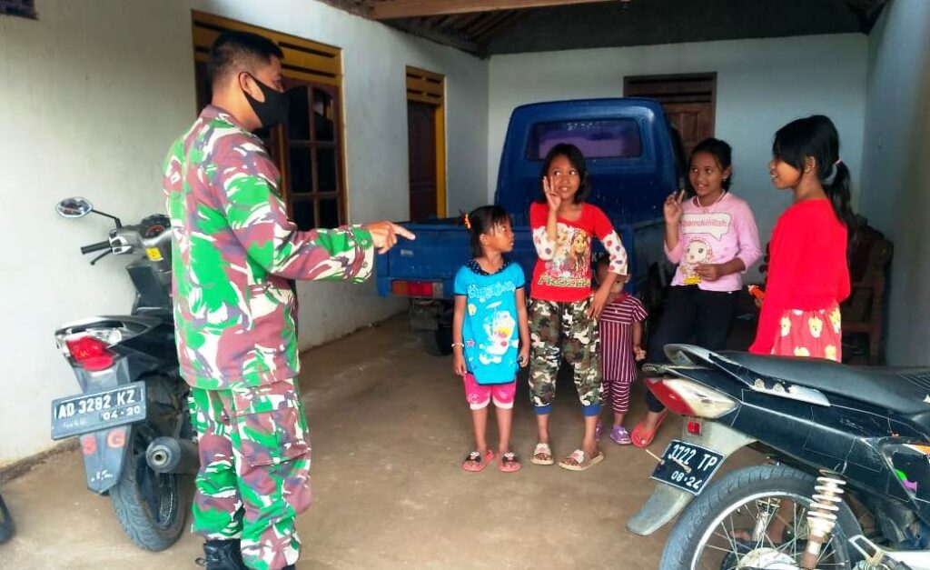 “Di sela-sela kegiatan utama, kami mengajak anak – anak yang sedang belajar di rumah, mengerjakan tugas diberikan guru. Mengingat saat ini anak-anak diliburkan sementara, untuk membatasi penularan virus Covid-19 ujarnya Sertu Heryadi.
