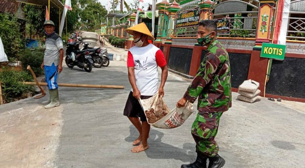 KORDANEWS – Sertu Sunarto salah satu anggota Satgas TMMD Reguler Ke-109 Kodim 0727/Karanganyar bersama Wagimin (60) warga Dusun Sonosari, Desa Jatiwarno mengangkat tanah dengan menggunakan alat seadanya (karung beras) untuk mempermudah menguruk jalan yang sudah dicor.