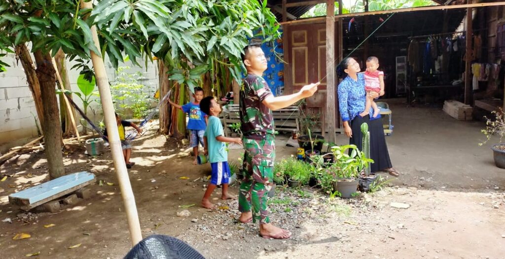 Pratu Ardi, salah satu anggota Satgas TMMD yang memanfaatkan waktu luangnya ikut bermain layang-layang dengan anak-anak Desa Sendang Kulon. Demi tugas, Pratu Ardi menyatakan tidak merasa malu saat asyik bersama anak-anak bermain layang-layang.