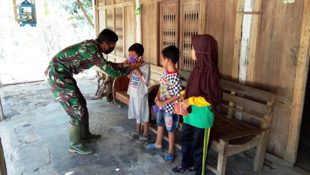 KORDANEWS – Satgas TNI Manunggal Membangun Desa(TMMD)Reguler ke 109 TA 2020 Kodim 0727/Karanganyar, memberikan pelajaran tentang acar menggunakan masker yang benar kepada anak-anak di Desa Jatiwarno , Kecamatan Jatipuro , Kabupaten Karanganyar.
