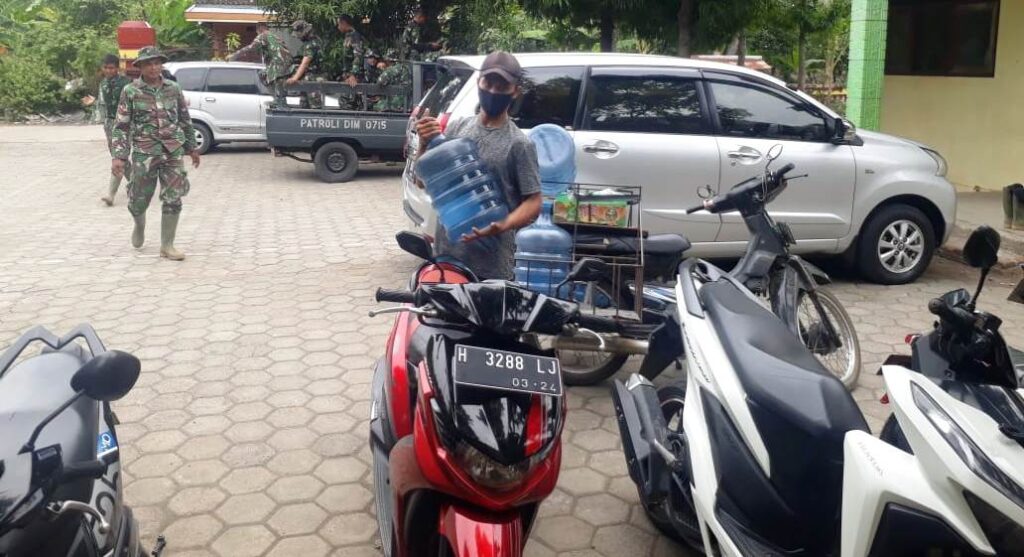 Suyanto (26) pedagang air mineral isi ulang warga Desa Sendang Kulon tampak sedang mengantarkan galon air mineral ke tempat istirahat satgas TMMD di SDN 1 Sendang Kulon.