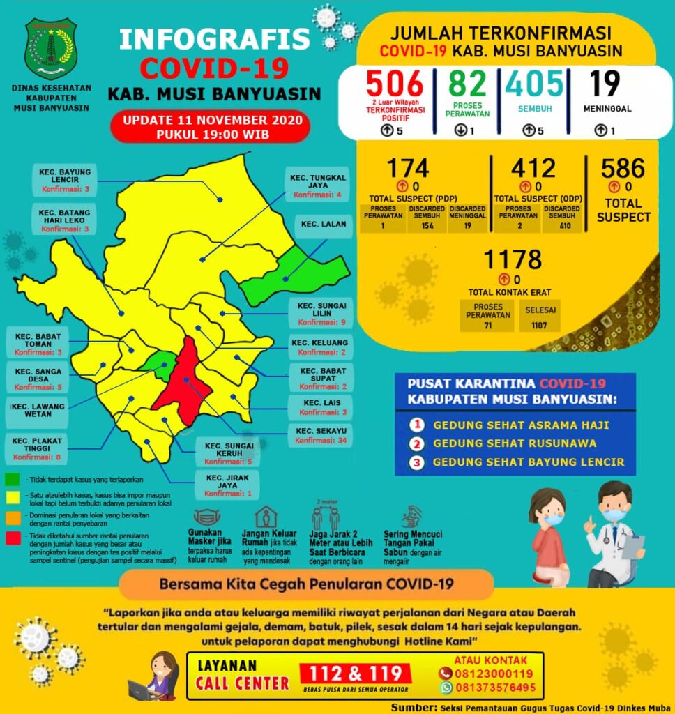 KORDANEWS – Gugus Tugas Penanganan Covid-19 Muba, Rabu (11/11/2020) mengkonfirmasi penambahan 5 kasus sembuh, 5 positif, dan 1 meninggal dunia.