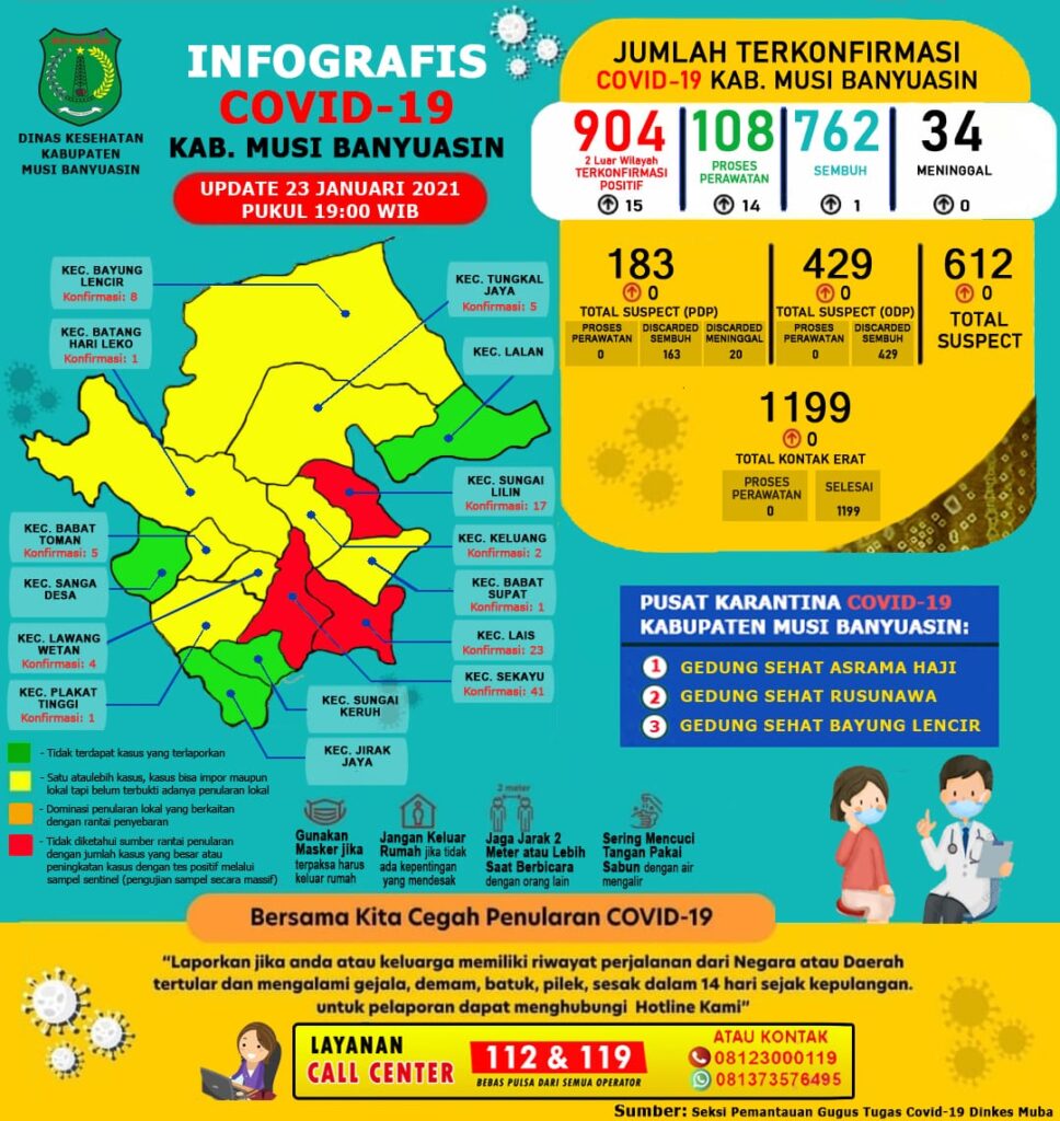 “Ada penambahan 1 kasus sembuh dan 15 positif Covid-19 per 23 Januari 2021,” ungkap Jubir Gugus Tugas Penanganan Covid-19 Muba, Seftiani Peratita.