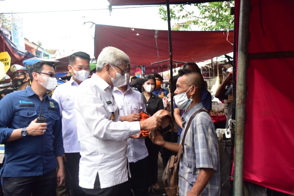 Kordanews – Guna memperketat disiplin masyarakat dalam menjaga protokol kesehatan (prokes) di masa pandemi Covid 19, Wakil Gubernur Sumsel H. Mawardi Yahya bersama Tim Satgas Covid 19 TNI dan Polri melakukan sosialisasi dan himbauan memakai masker ke pasar tradisional 16 Ilir Palembang, Rabu (3/2/2021) pagi. Aksi bagi-bagi 10.000 masker gratis ini disambut antusias oleh pedagang dan pengunjung pasar yang kebetulan ada di lokasi.